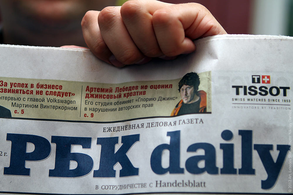 ![]() The studio’s staff attorney Yevgeny Potanin demonstrating RBK Daily newspaper with “Artemy Lebedev might sue Gloria Jeans for breach of copyright” article announced on the front page.