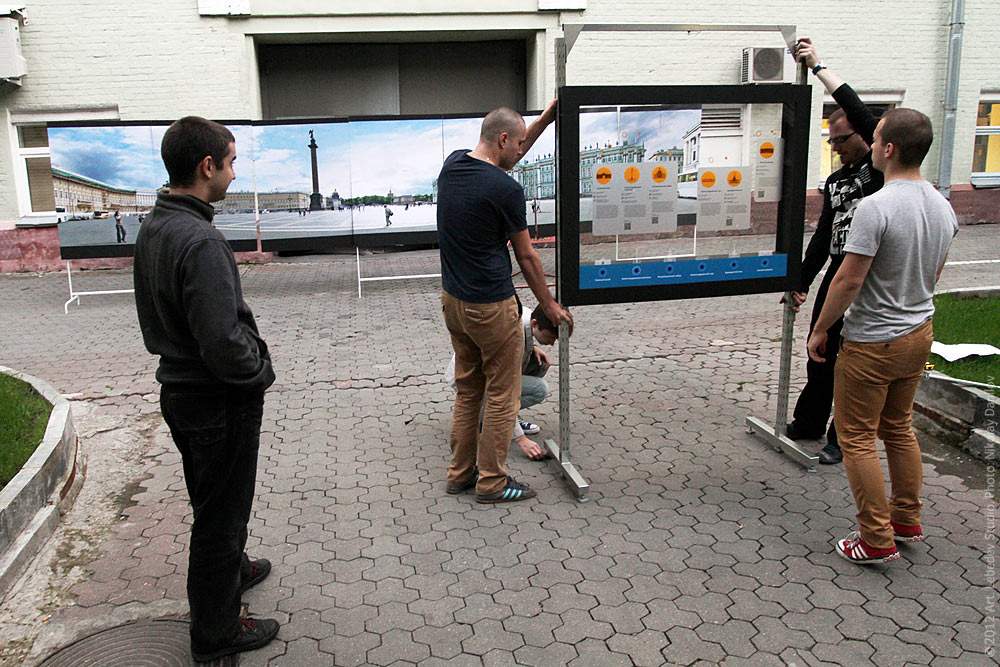 The industrial design department field-testing Moscow navigation panel prototype in the studio’s courtyard.