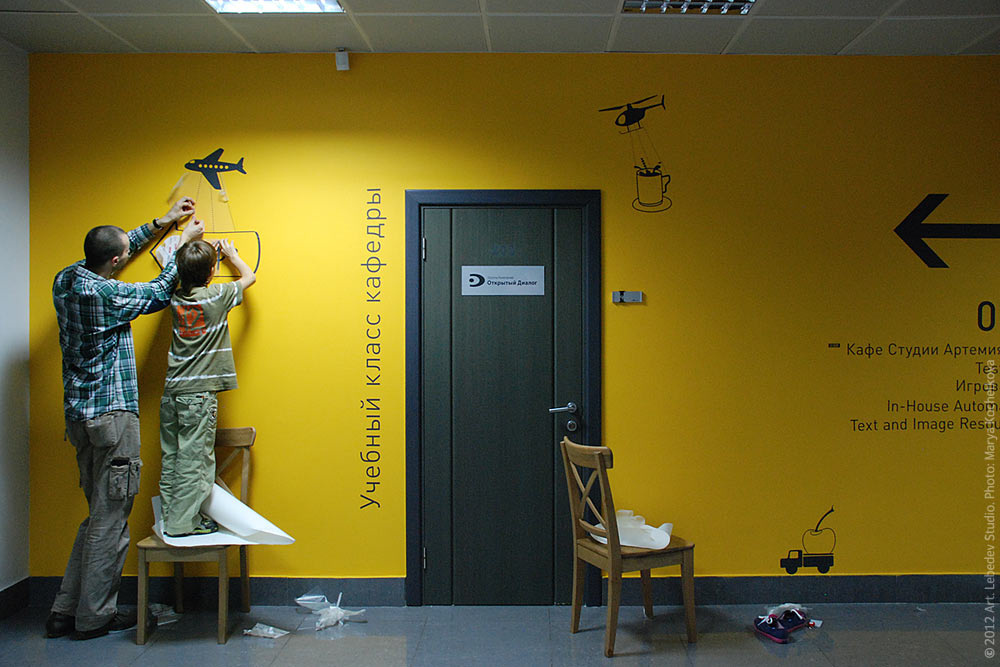 ![]() ABBYY Headquarters: Daniil Iglin, a son of the company’s employee, assisting our designer Nikita Nikitin in installing the studio’s café-pointing navigation element.