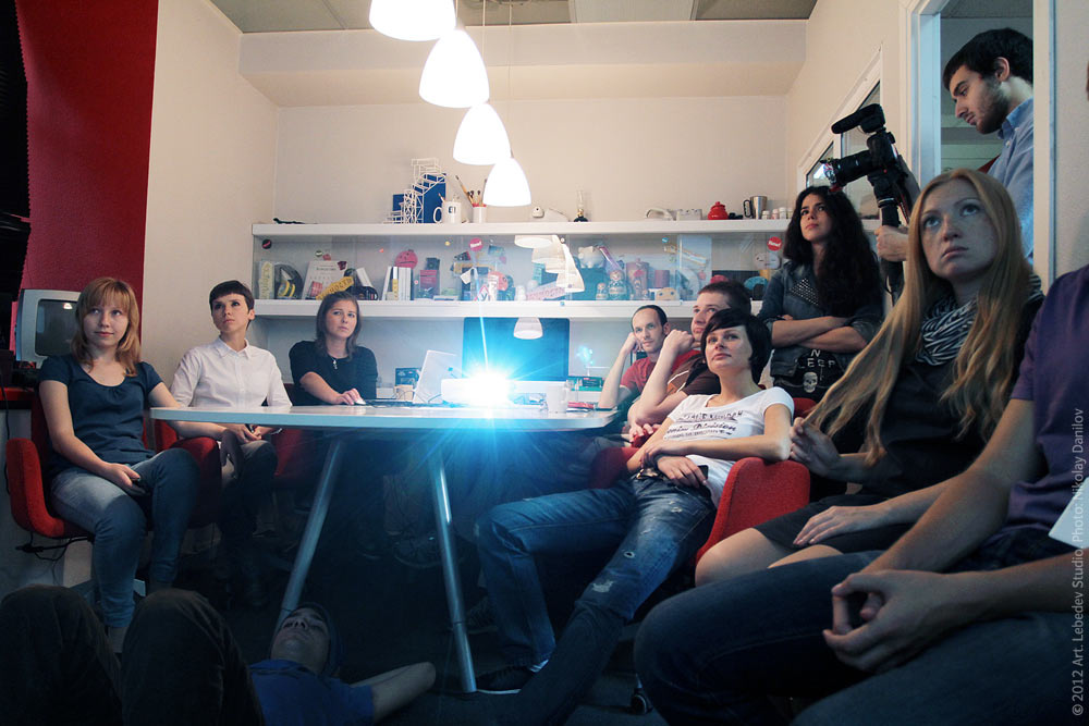 ![]() Another presentation at the studio: project manager Natalia Iliycheva (center, next to the projector) shared some behind-the-scenes of building Sto Loto website. |