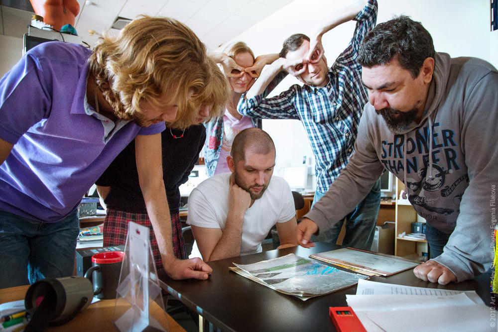 ![]() Art director Erken Kagarov (far right) is talking about the main design publication of his childhood—America magazine.