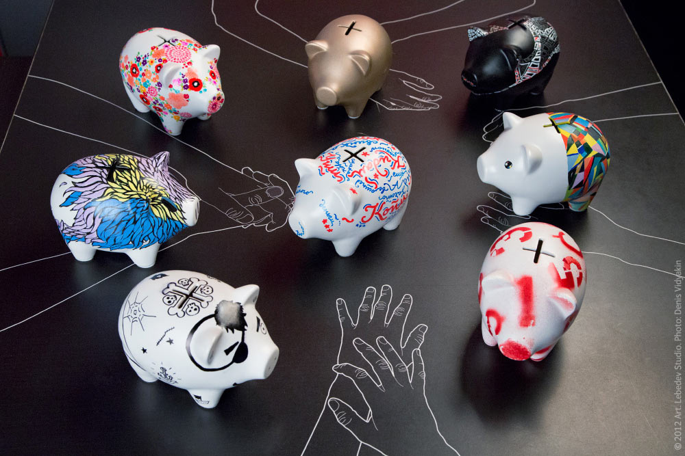 ![]() The studio’s folks decorated a bunch of Kopilkus piggy banks. Clockwise from bottom left: pirate Kopilkus by designer Yevgeny Zorin, Kopilkus with feathers by designer Natasha Baiduzha, flower Kopilkus by illustrator Lisaveta Romantsova, golden Kopilkus by designer Maxim Milko, black Kopilkus by project manager Natalia Moskalyova, colorful-pants Kopilkus by photographer Yevgenia Filatova, “digital” Kopilkus by designer Iskander Mukhamadeyev, and type Kopilkus (center) by type designer Ksenia Yerulevich.
