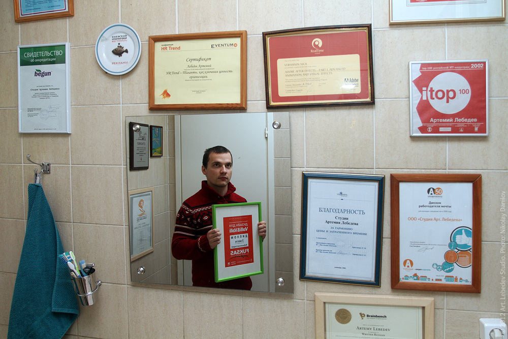 ![]() Designer Andrey Fabishevsky is just about to decorate a restroom on the first floor of the studio’s headquarters with the Best Door Leveler Design award from Valli and Valli.