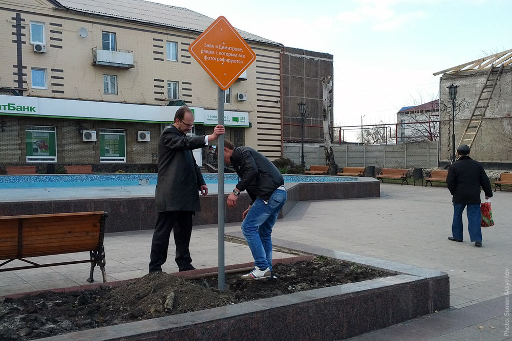 ![]() Ukraine, Donetsk region, Dimitrov: deputy mayor Aleksander Ponomarenko (left) installs The Sign in Dimitrov Everyone Takes Pictures With.
