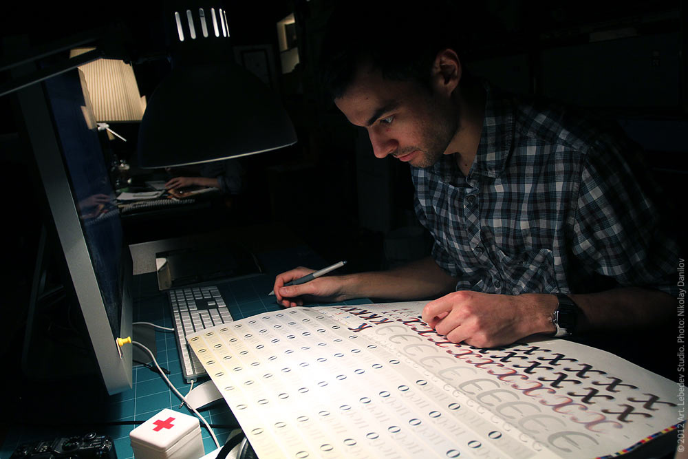 ![]() Designer Iskander Mukhamadeyev examines color proof for the second edition of Yuriy Gordon’s Book of Letters From Аа to Яя.