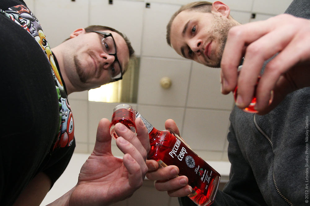 ![]() Designers Alexei Sharshakov and Vladimir Pavlenko testing a bottle of sweet cranberry liqueur Russian North, now available in stores around the country.