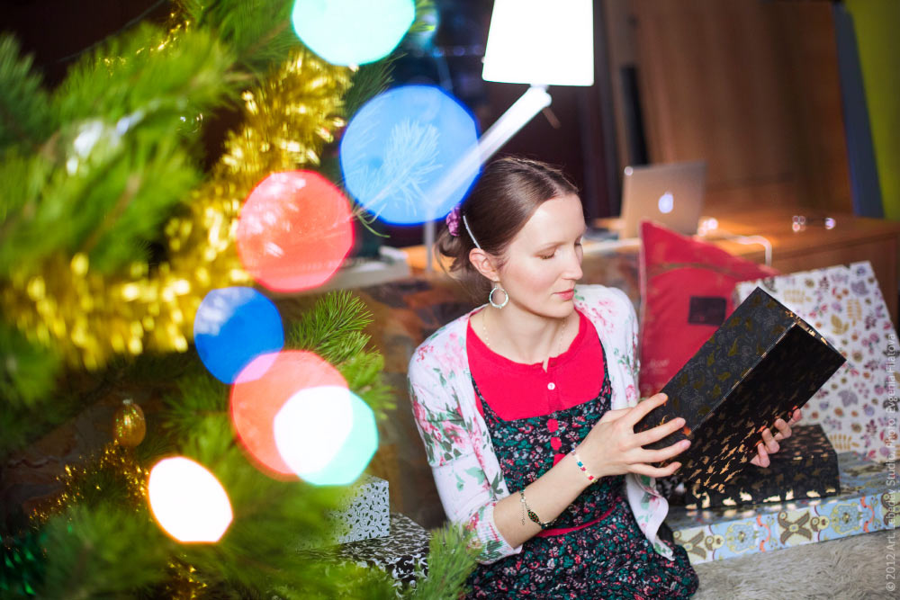 Illustrator Lizaveta Romantsova admiring gift boxes for the studio’s stores.