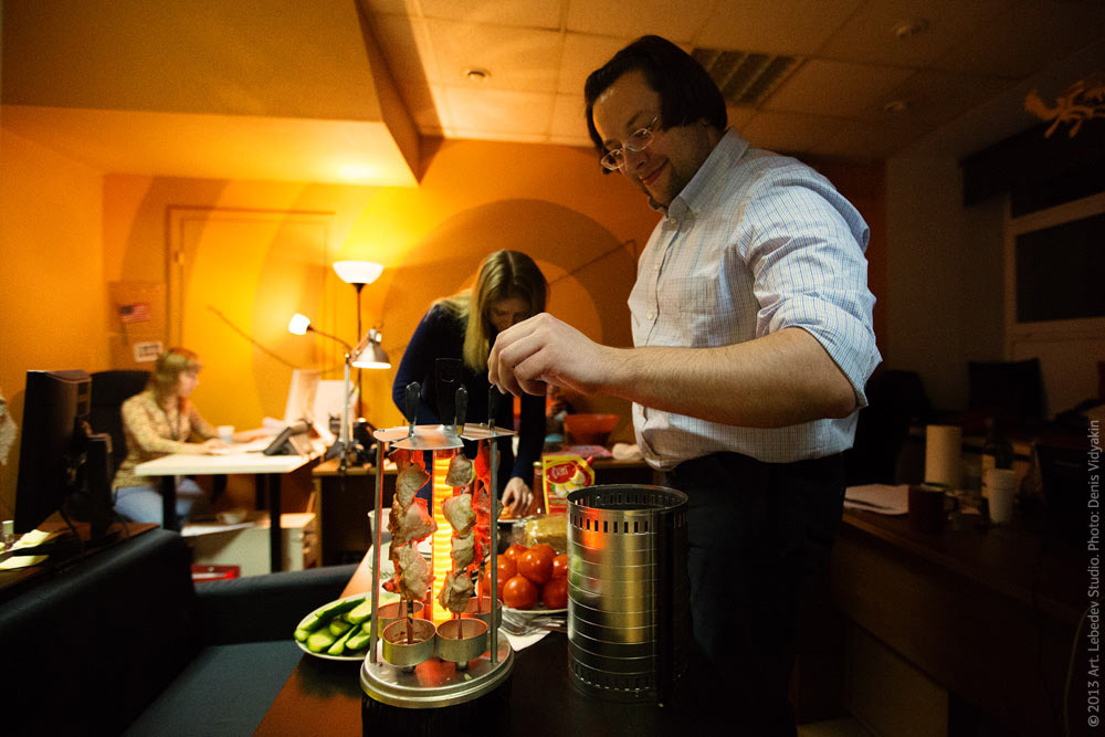 Attorney Yevgeny Potanin cooking shashlyk kebab on the first floor of the studio’s headquarters.