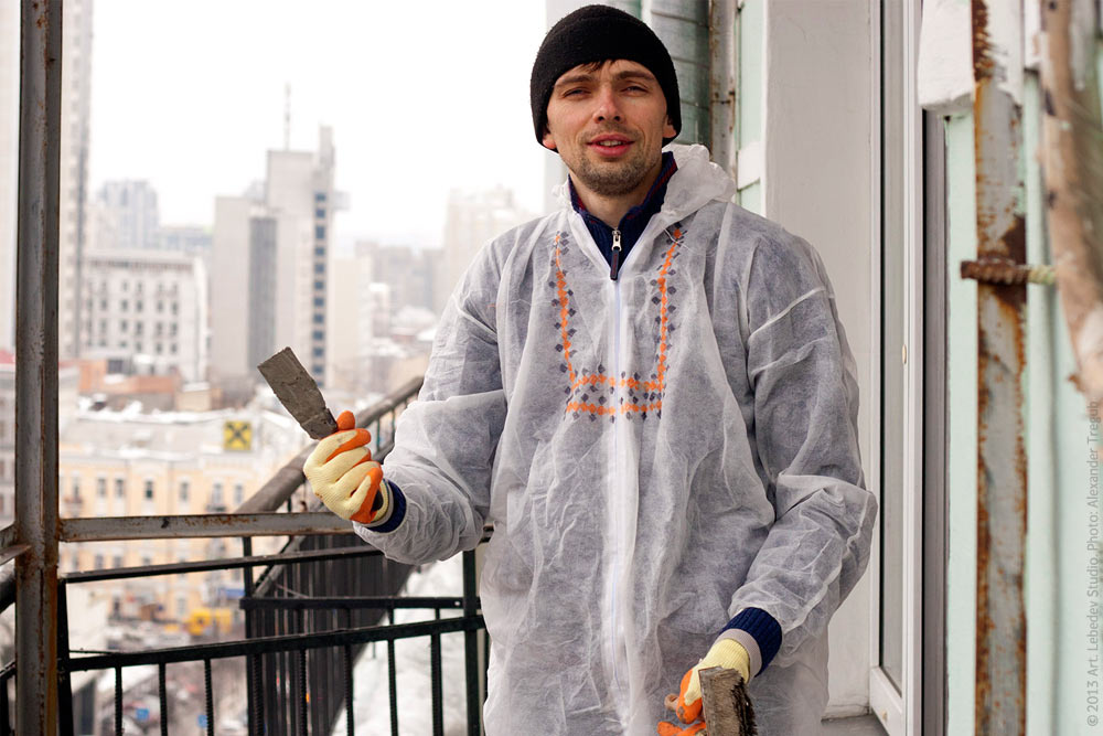 The studio’s Kiev office director Maksim Stupenko directing the balcony renovation.