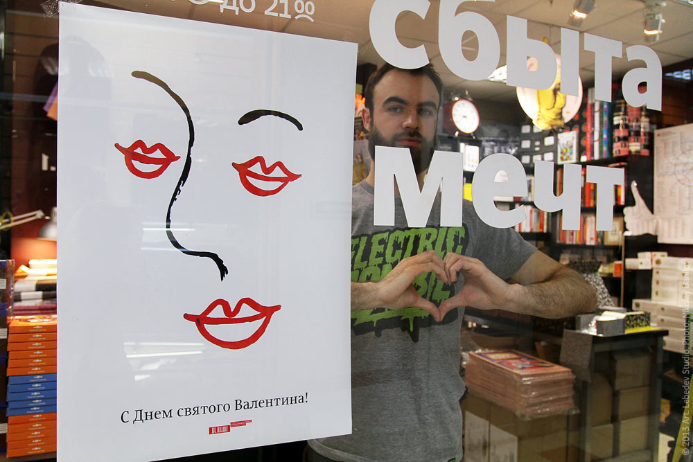 Sales associate Ivan Safin dressing up the studio’s Dreams Realization Point with a Valentine's Day poster.