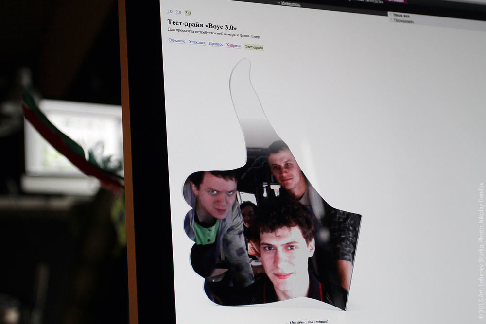 Designers Sergey Kulinkovich, Pavel Gerasimchuk, and Oleg Pshenichny performing a Vous 3.0 mirror test drive.
