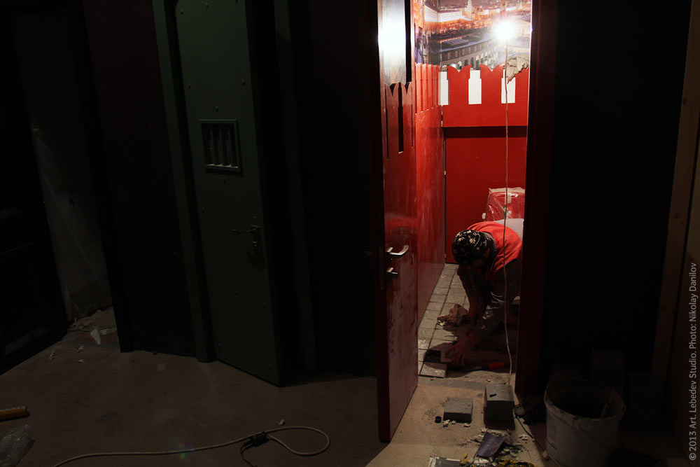 Renovation at the studio’s new office: a worker laying the floor in one of the restrooms.