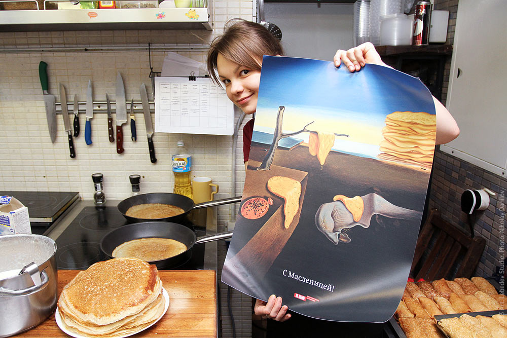 ![]() The studio’s café on Bolshaya Nikitskaya is getting ready for Russian Mardi Gras—Maslenitsa. Pictured: barista Irina Babiy with Maslenitsa poster in the café’s kitchen.