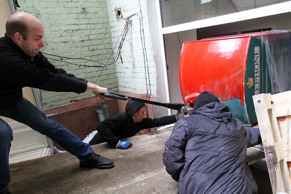 ![]() The studio is moving to the new office. Pictured: workers removing the British phone booth out of the old office via window.