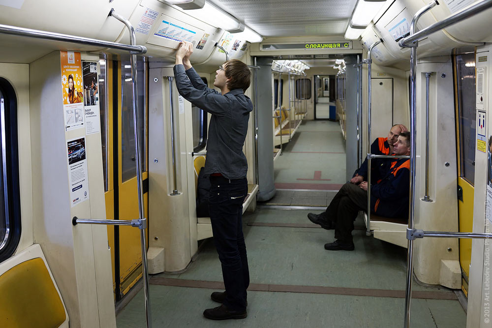 ![]() Varshavskoye Metro Depot: designer intern Mark Rodionov field-testing the Moscow Metro map stickers created in the studio against a LED-panel installed in Rusich metro cars.