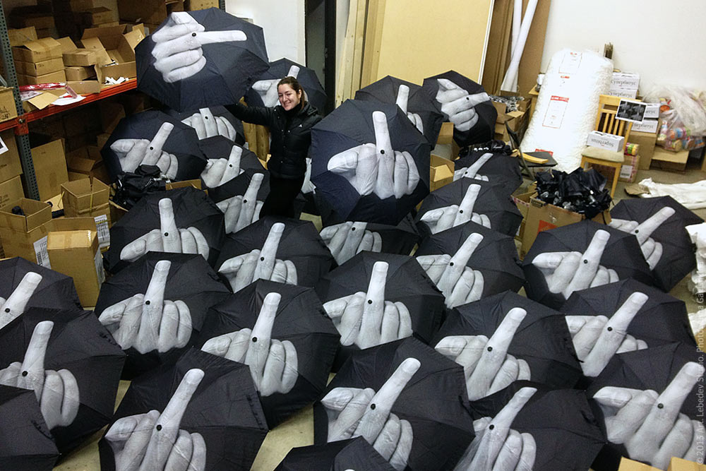 ![]() The studio’s warehouse in New Jersey: sales manager Marina Berzegova testing a bunch of Fuck the Rain umbrellas before shipping them to a customer.