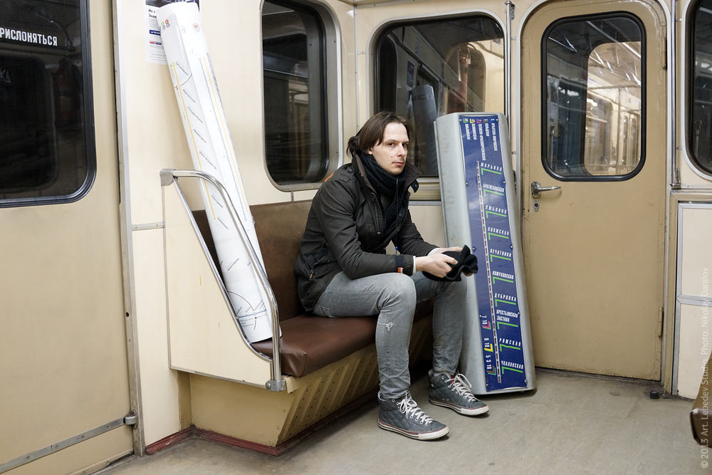 Designer Egor Zhgun transporting an old LED metro car panel by Moscow subway.