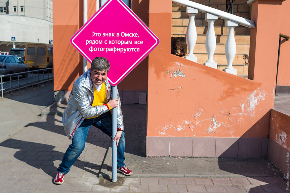 Blogger Sergey Dolya with the Sign Everyone Takes Pictures With in Omsk, Russia.