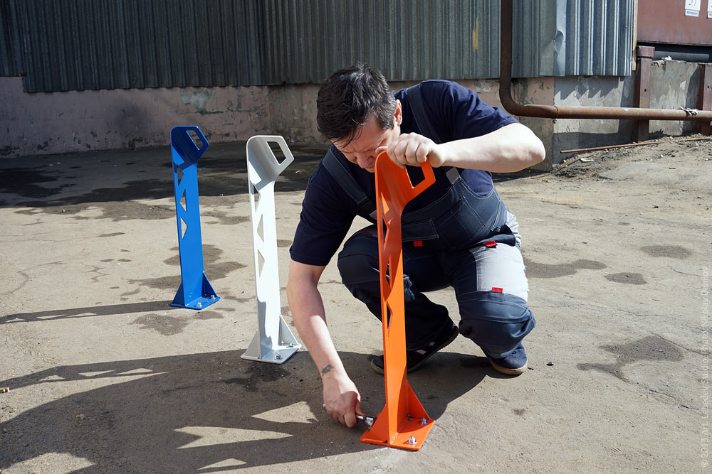 Engineer Dmitry Fomichyov installing Veloparkus modular bike parking rack at the studio’s courtyard.
