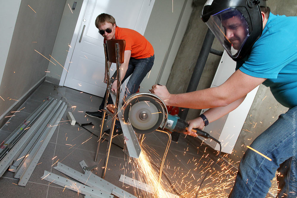 Production manager Alexey Strelnikov and sales associate Ivan Kudryavtsev cutting shelving to length.