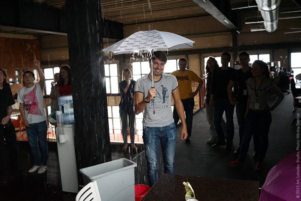 Emergency at the studio: heavy rain broke the roof and flooded the office.
