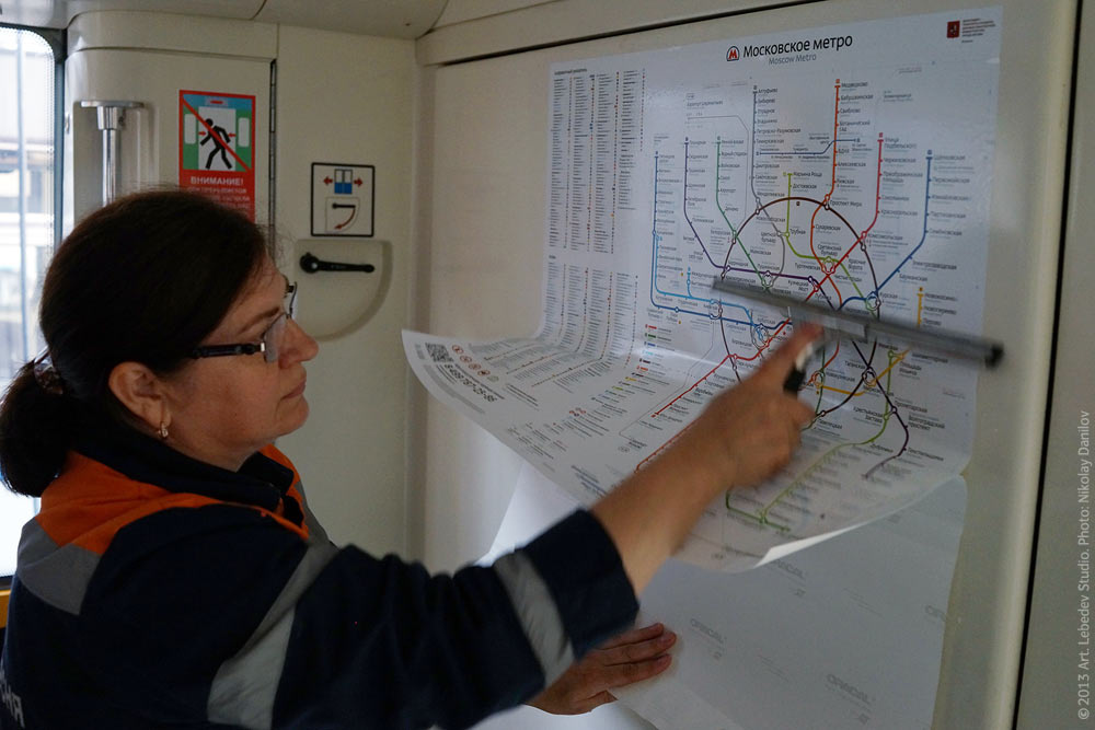 ![]() Krasnaya Presnya Metro Depot: the new Moscow Metro map developed in the studio is being installed in metro cars.