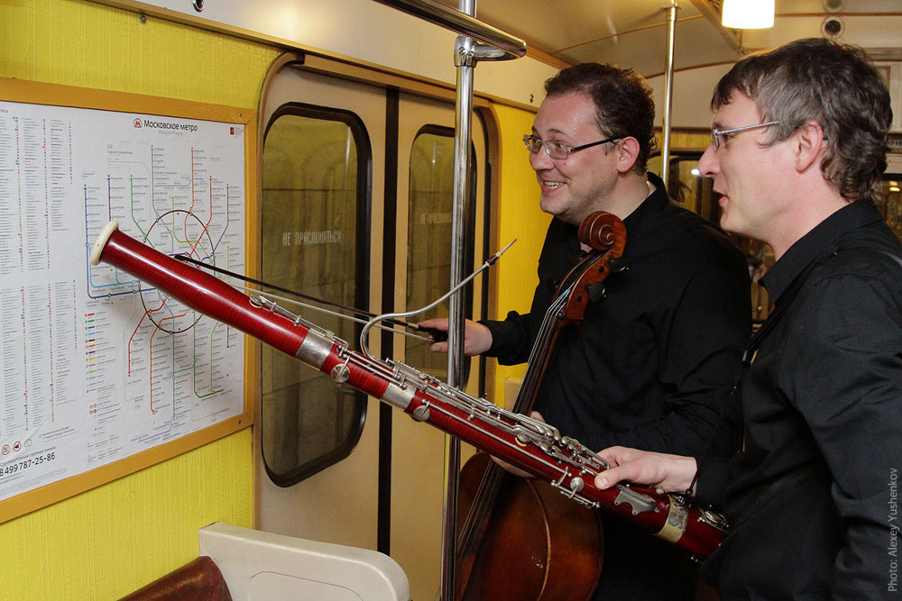 ![]() The State Academic Bolshoi Theater soloists Boris Lifanovsky (cello) and Andrey Rudometkin (fagot) studying the new Moscow Metro Map created in the studio while going to Kropotkinskaya station to play at the night concert celebrating 78 years since the opening of Moscow Metro.