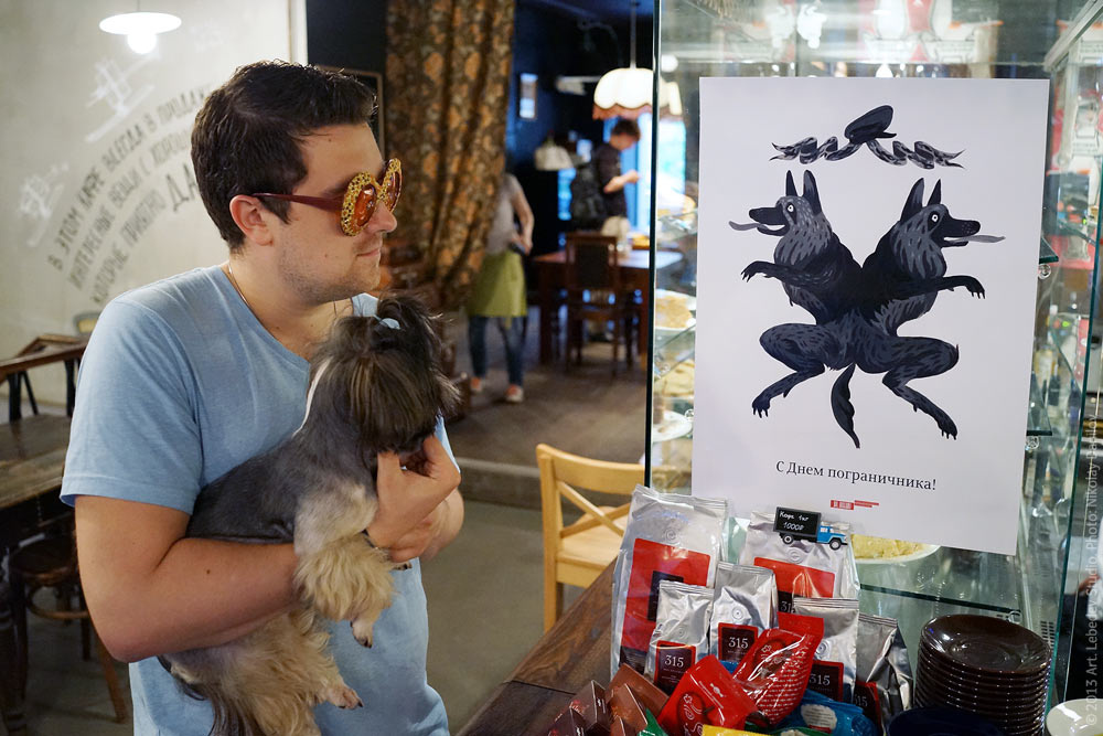 The studio’s Big Café: shih tzu Zaika with her owner studying a Border Patrol Day poster.