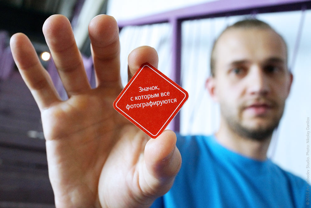 Designer Vladimir Pavlenko showing a Pin Everyone Takes Pictures With.
