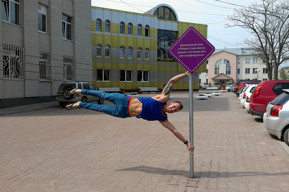 Strong and fit citizen of Yuzhno-Sakhalinsk, Russia, posing with The Sign Everyone Takes Pictures With.