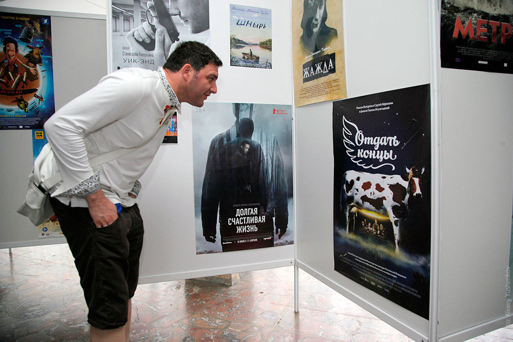 Sochi, 24th Kinotavr Russian Open Film Festival: actor Maksim Vitorgan studying Bite the Dust movie poster.