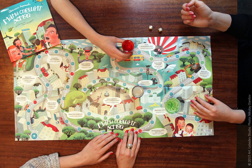 ![]() At night, after the studio's Big Café closes down, hostesses Alisa Panafidina, Valeria Suslova and ex-hostess Natalia Karpova play the game that comes with the second edition of Mum's Hurrying Home by Svetlana Dorosheva, illustrated by Olga Degtyareva.