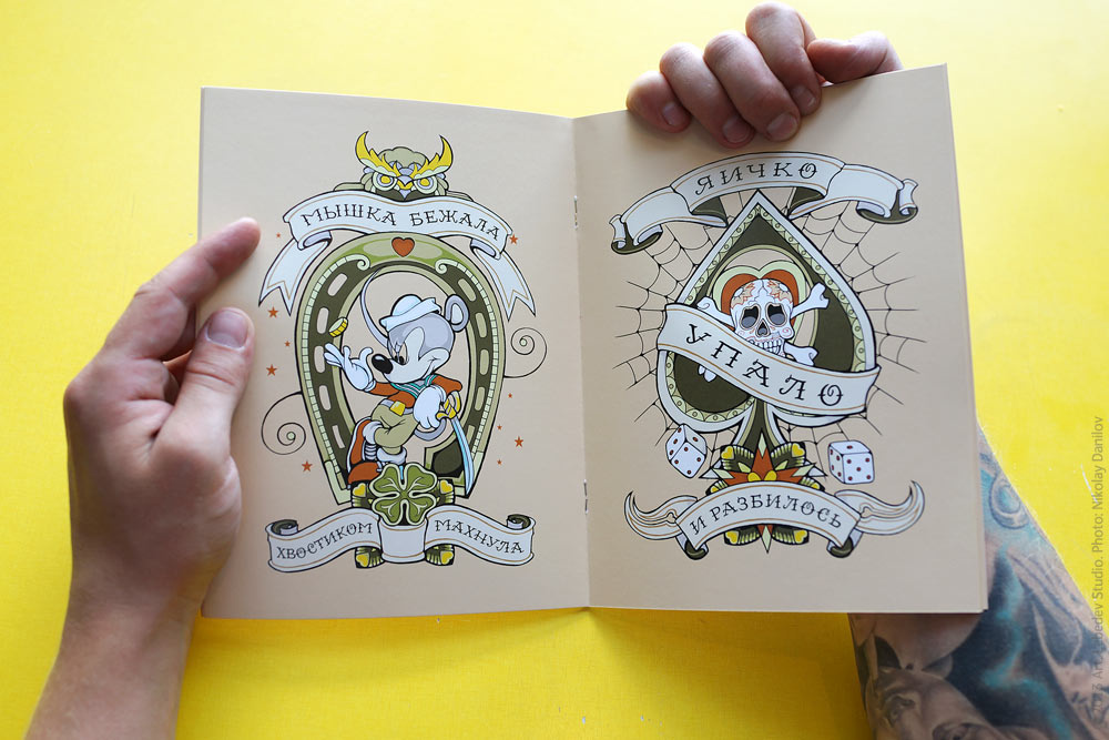 Barista Maxim Manylov studies the book Ryaba the Hen by Mikhail Buster.