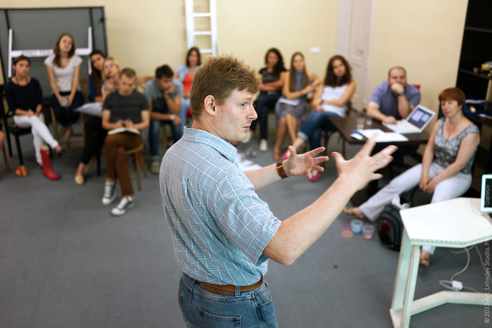 Studio lectorium: project management expert Maxim Dorofeev conducts a business game with studio managers.