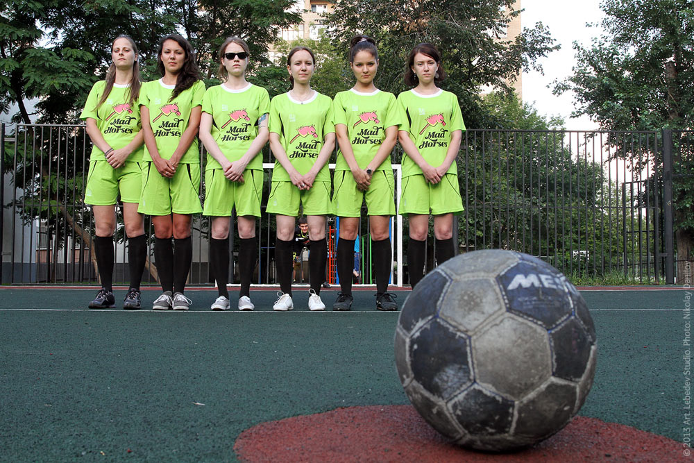 ![]() Mad Horses team players (left to right: project manager Lida Popova, project manager Varvara Lagutina, designer Alina Yagfarova, editor Anna Potapkina, project manager Inna Sidorova, designer Olga Konovalova) get ready for the studio's 7th Mini Football Championship.