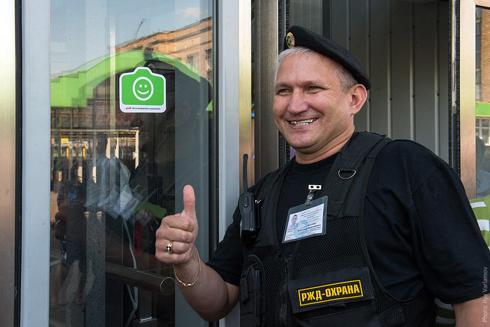 ![]() To remind the passengers that amateur photography at railway stations is allowed without prior approval, Russian Railways decorated the stations in Moscow, Saint Petersburg, Vladimir, Kazan and Nizhny Novgorod with the Photography Allowed sign. Pictured: security guard at Yaroslavsky railway station in Moscow supports the freedom of photography.