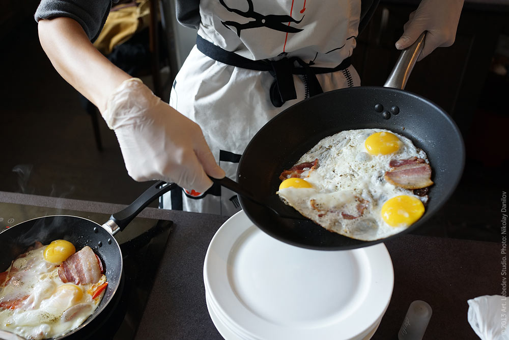 Every morning, omelettes, fried eggs, and hot cereals are cooked at the studio’s cafeteria on the seventh floor.
