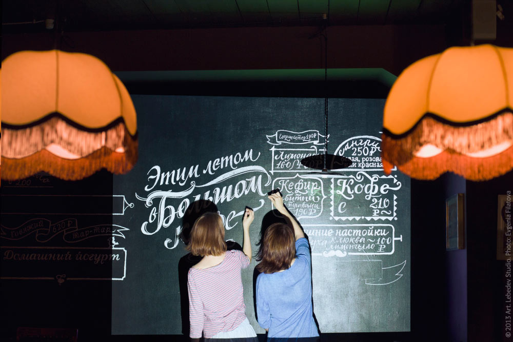 Type designer Ksenia Yerulevich and designer Olga Le decorate a wall at the studio’s Big Café.