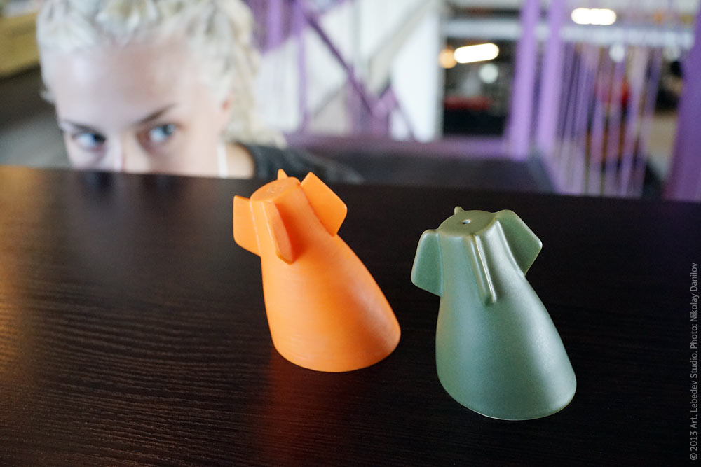 Modeler Alexandra Sviridova examines a styrofoam mock-up (left) and a ceramic prototype of Bombus salt shaker.