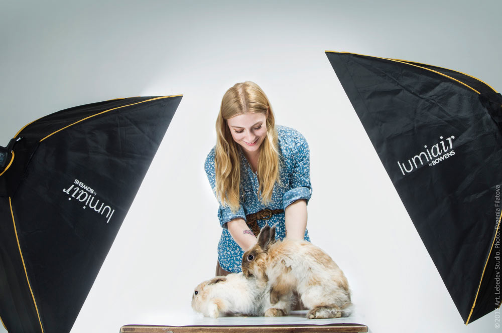 Production manager Lisa Joel with her pet rabbits who she brought to the studio for a photoshoot.