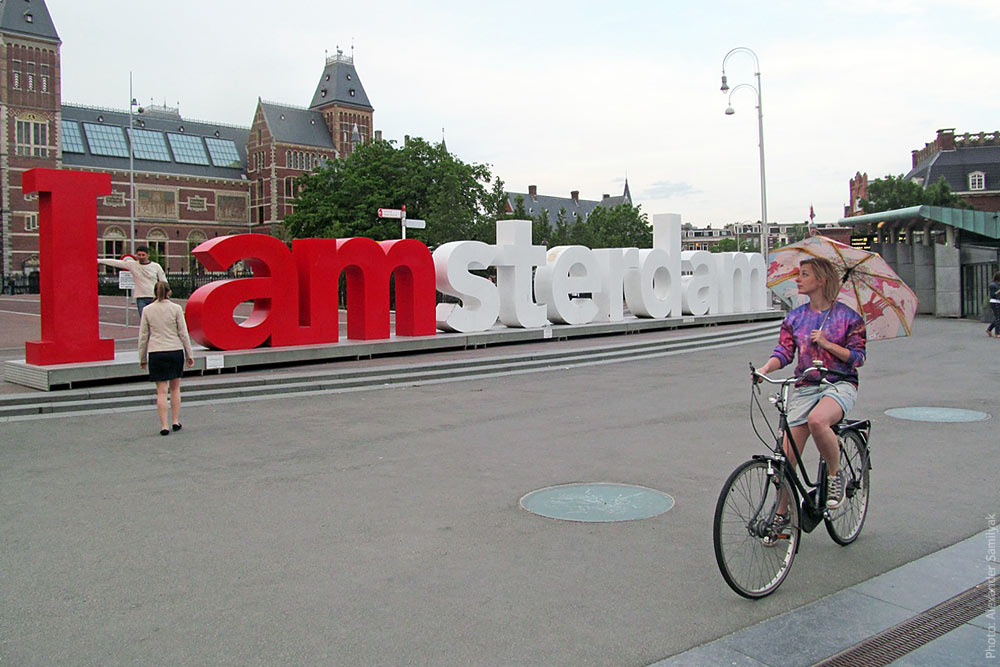 Project manager Yelena Khokhrina riding he bike around Amsterdam with a Sensual Empire umbrella.