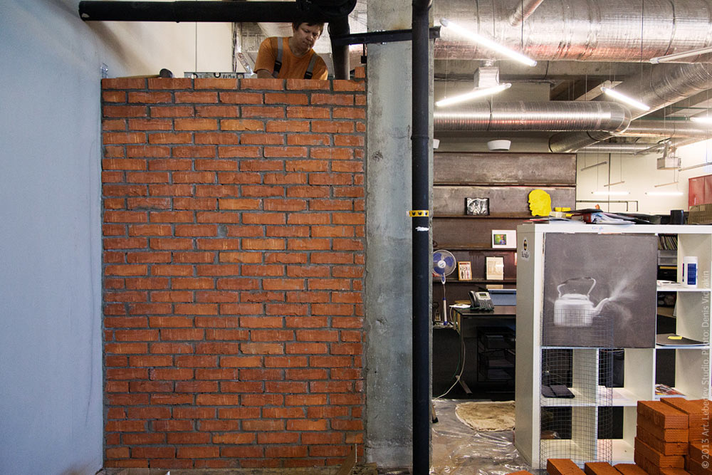 Engineer Dmitry Fomichyov building a wall at the studio.