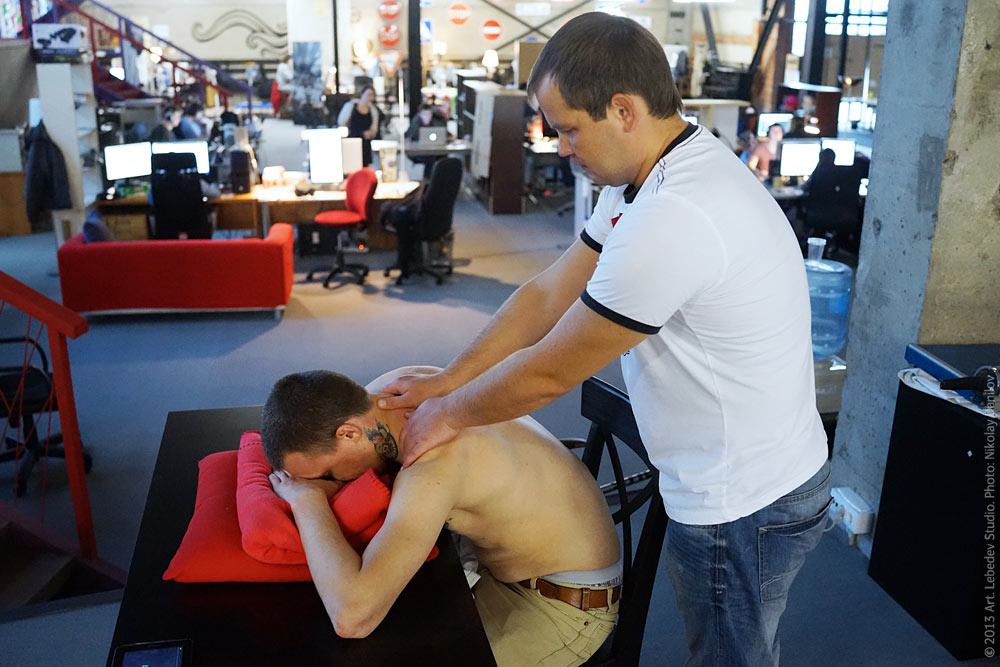 The studio’s special guest Konstantin Kasin, a massage therapist from V. Dikul medical rehabilitation center, working out the employees’ muscles.