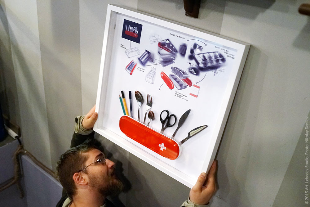 ![]() The studio’s Big Café: sales associate Fedor Somov, who came for his internship to Moscow from Saint Petersburg, mounting a chart of Swissarmius concept evolving into actual Swissarmius.