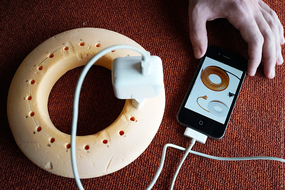 Designer Andrey Fabishevsky demonstrates a mock-up of the Rozetkus Bublikus power strip.