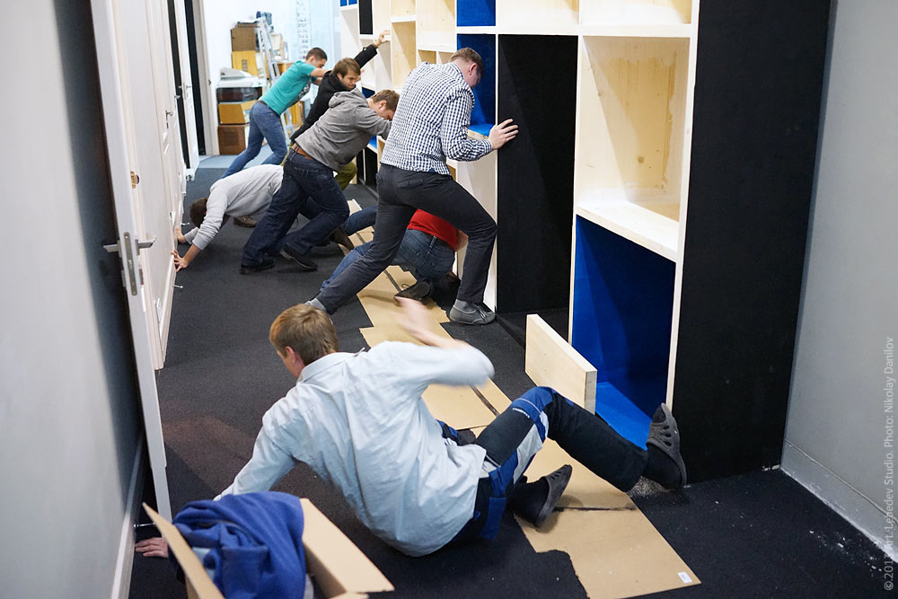 ![]() Studio employees (top to bottom: engineer Sviatoslav Dyachenko, sales manager Ivan Travinsky, engineer Sergei Sinitsyn, project manager Andrey Gundyrev, system administrator Daniil Alexandrov, intern Grigory Sharov and project manager Vsevolod Chagaev) move the new storage rack in place.