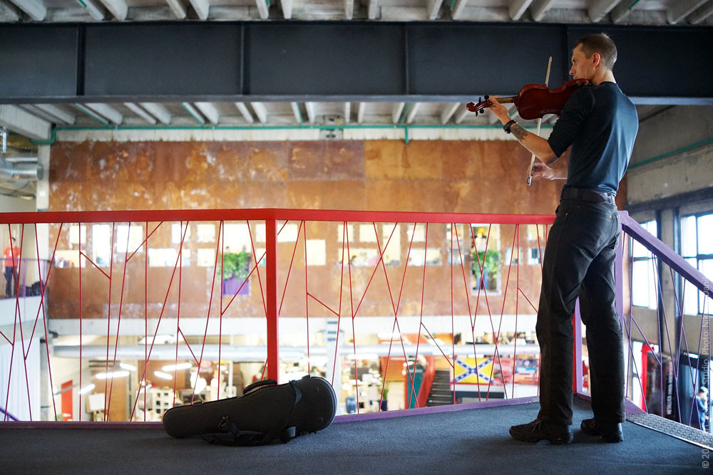![]() Violinist Vitaly Ermushkevich performs a piece from the first movement of the Concerto in A minor by Antonio Vivaldi on the seventh floor of the studio.