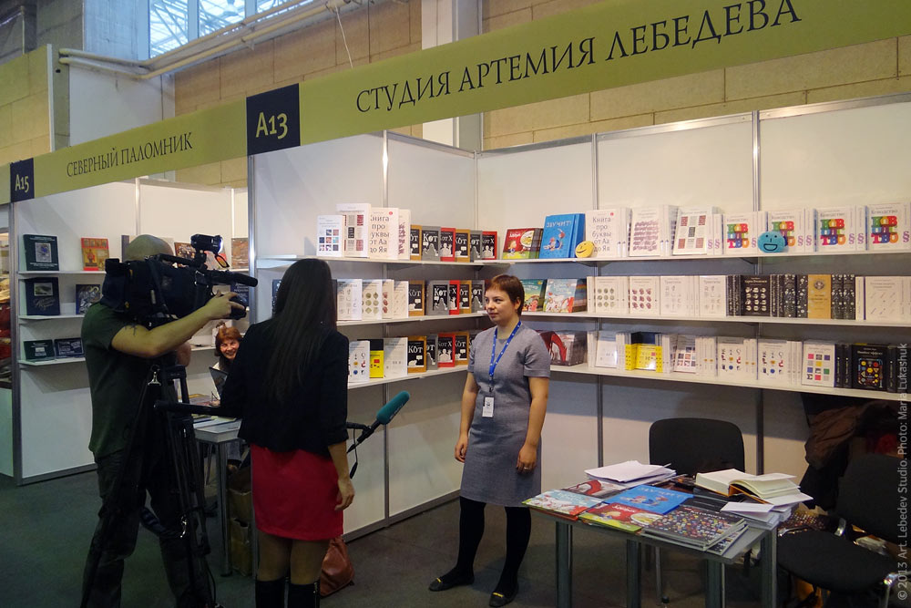 7th Krasnoyarsk Book Culture Fair: sales manager Anna Samsonova gives an interview to RBC-TV at the studio’s booth.