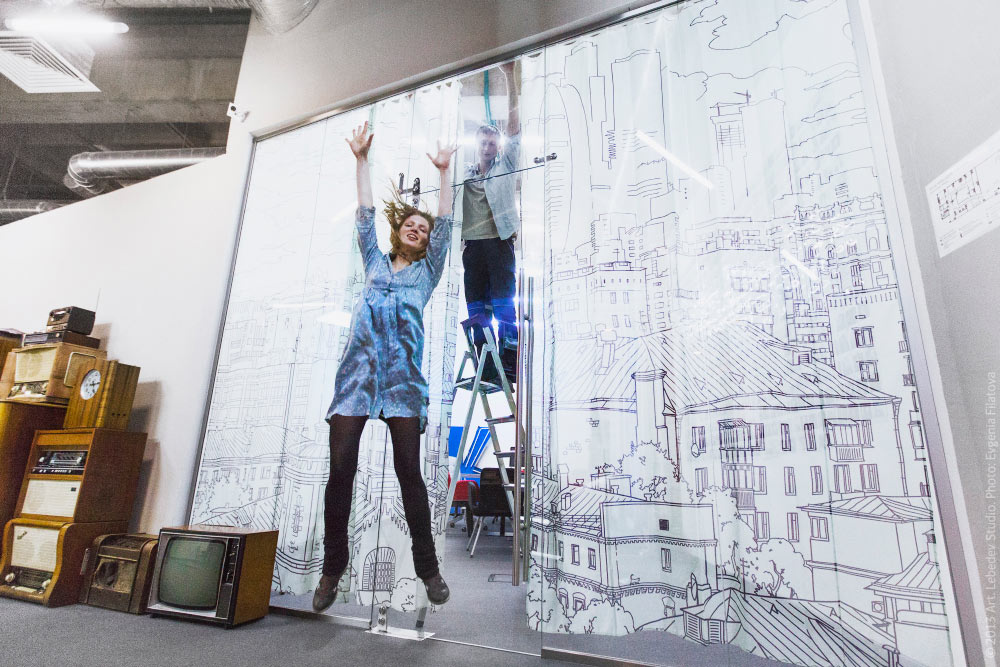 Illustrator Lizaveta Romantsova and her curtains with views of Moscow for the studio meeting room.