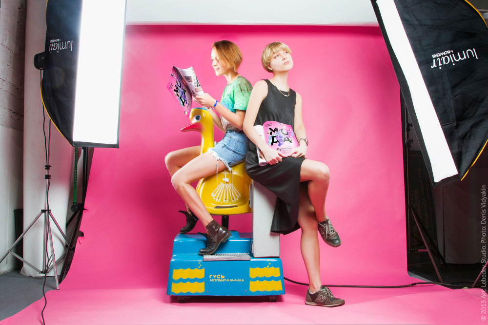 ![]() Photographer Yevgenia Filatova and designer Olga Bazilevich are being photographed with an edition of the Vogue magazine with an ad for Modny Season shopping arcade.